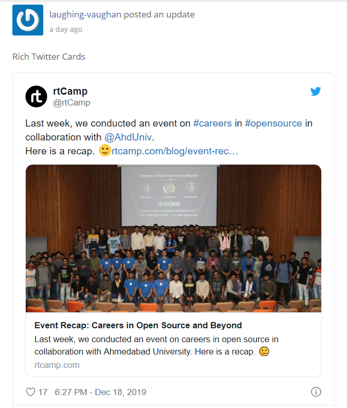 Apart from displaying the usual link previews for all websites, the rtMedia Activity URL Preview add-on also supports rich previews for sites like Twitter, SoundCloud, Vimeo, and SlideShare.