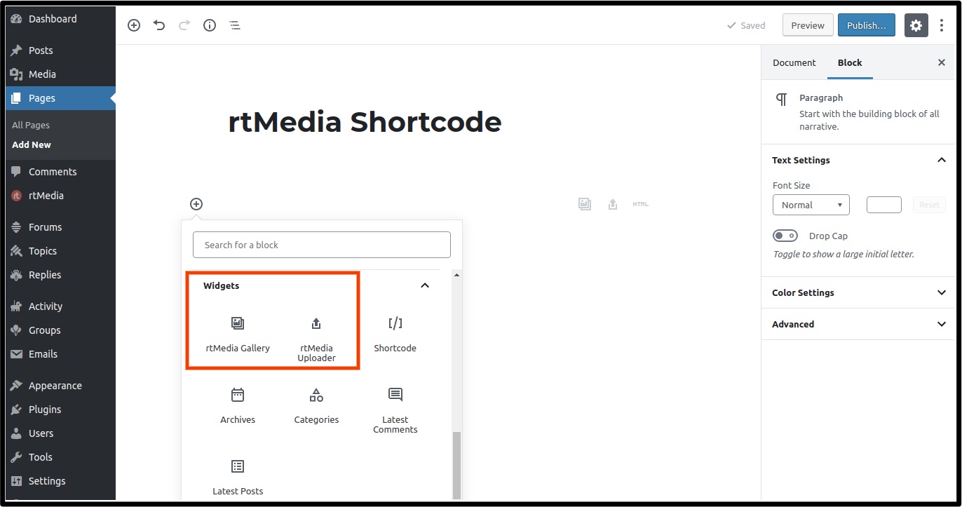Please explore new rtMedia Gallery Block and rtMedia Uploader Block.