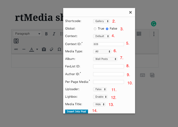 - If Global is set to False in Step 3, choose the Context from which the gallery should be drawn. If Global is set to True, this drop down does not appear. The context determines the WordPress, BuddyPress or bbPress context from which media or other items are displayed. If Default is chosen, items associated with the current context will be considered. Read more: Context in rtMedia.