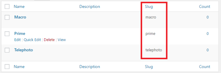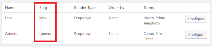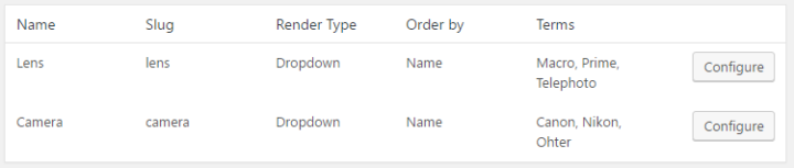For example, the website in the screenshot below has two Attributes (Lens & Camera). Each Attribute has three terms associated with it.