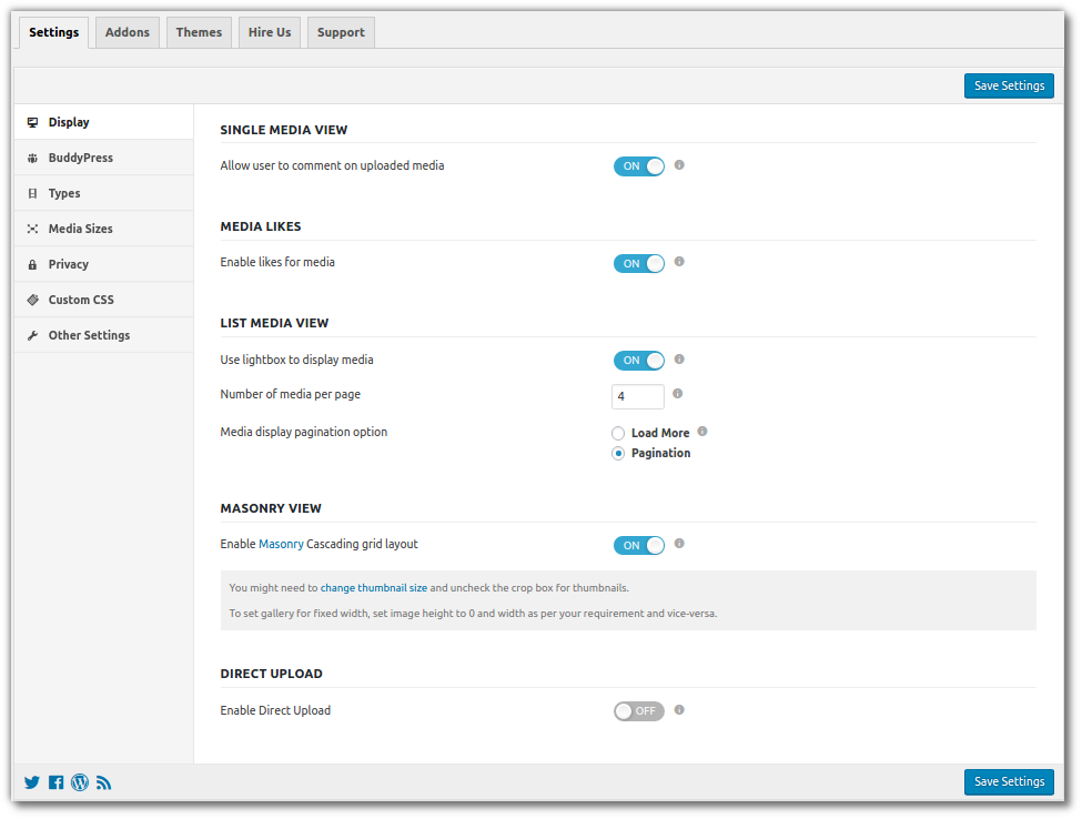 Allow user to comment on uploaded media setting enables or disables user comments on all media posts. Note that this setting only applies to Comment fields within a lightbox; users can still comment on media in the BuddyPress Activity feed.