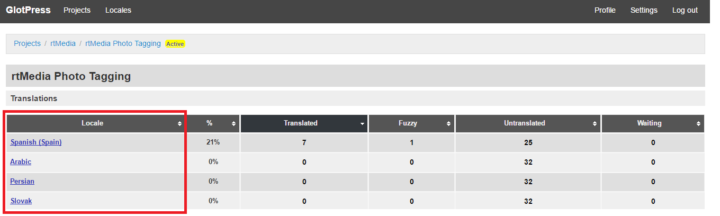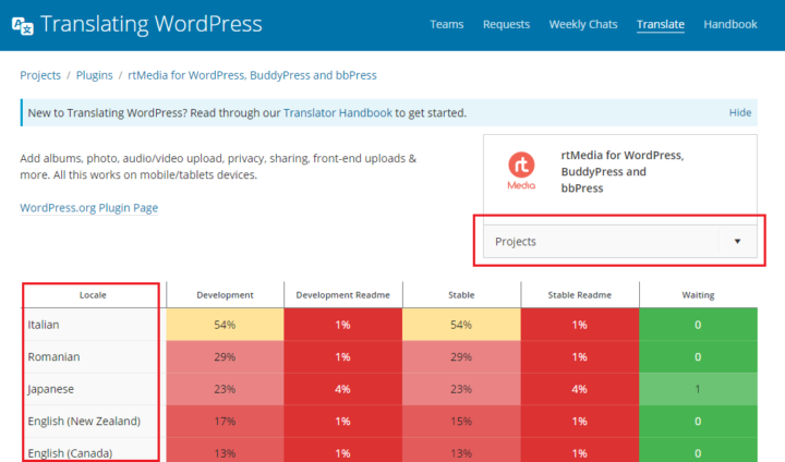 Go to https://translate.wordpress.org/projects/wp-plugins/buddypress-media. Make sure that you have “Projects” selected. You will see a list of translatable languages: