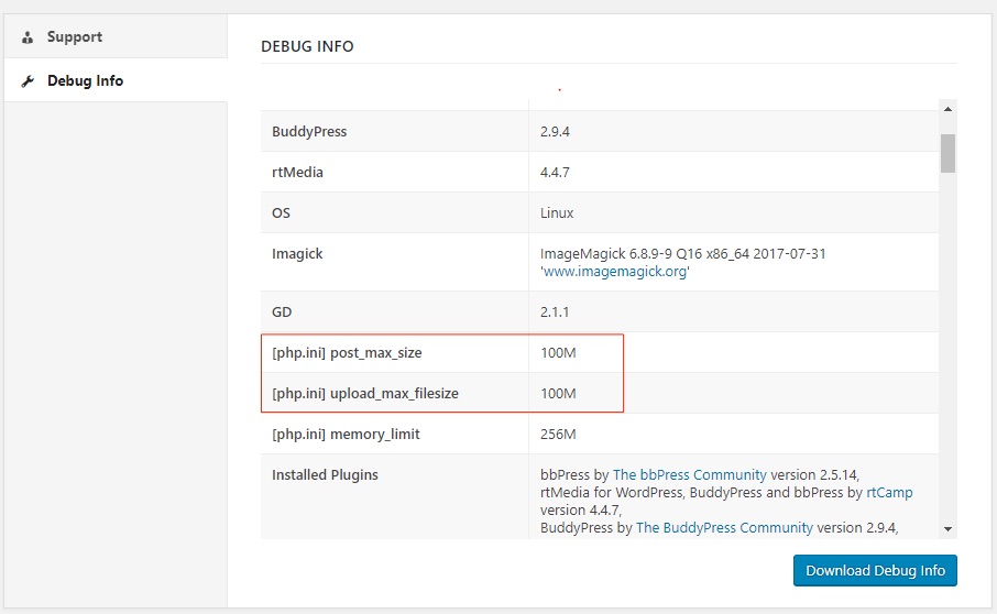 - To check the filesize parameter, go to WordPress dashboard > rtMedia > Support > Debug Info screen. I have attached a screenshot of the same.