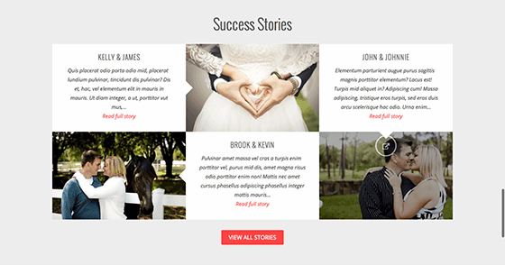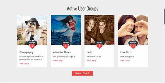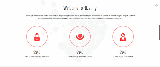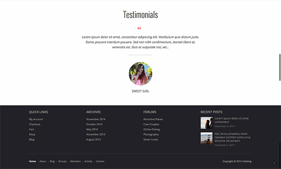 rtDating theme came up with nice design of home page template. It contains Slider, Welcome Content, Success Stories, Top members, User groups, Testimonials etc.