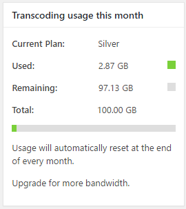 In the above screenshot, a user has the Silver plan activated on her website. Her users have uploaded 2.87 GB worth of videos thus far, and can upload 97.13 GB worth of videos more. Thus, the user has consumed 2.87 GB of her bandwidth for the month thus far.